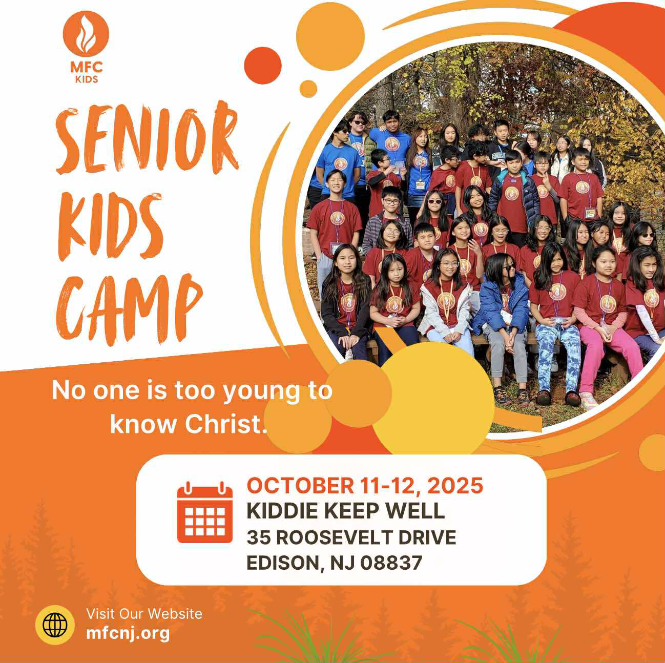 Kiddie Keep Well Camp 35 Roosevelt Drive, Edison, New Jersey, United StatesA two-day live-in camp for the Footsteps and Step Up (age 8 -12 years old) groups, wherein kids can have fun while they see and hear the Word of God being proclaimed by their older brothers and sisters in MFC Youth, make friends as they play games, share experiences, and entertain one another in a...